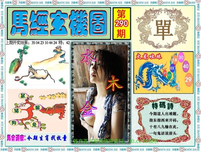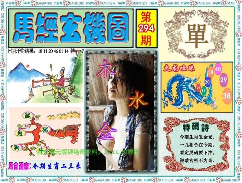 294期马经玄机 特碼詩:今期生肖发金光,一九相合在今期,看定灵码要下注,说破玄机不为奇. 解肖:鼠兔狗牛猪 |